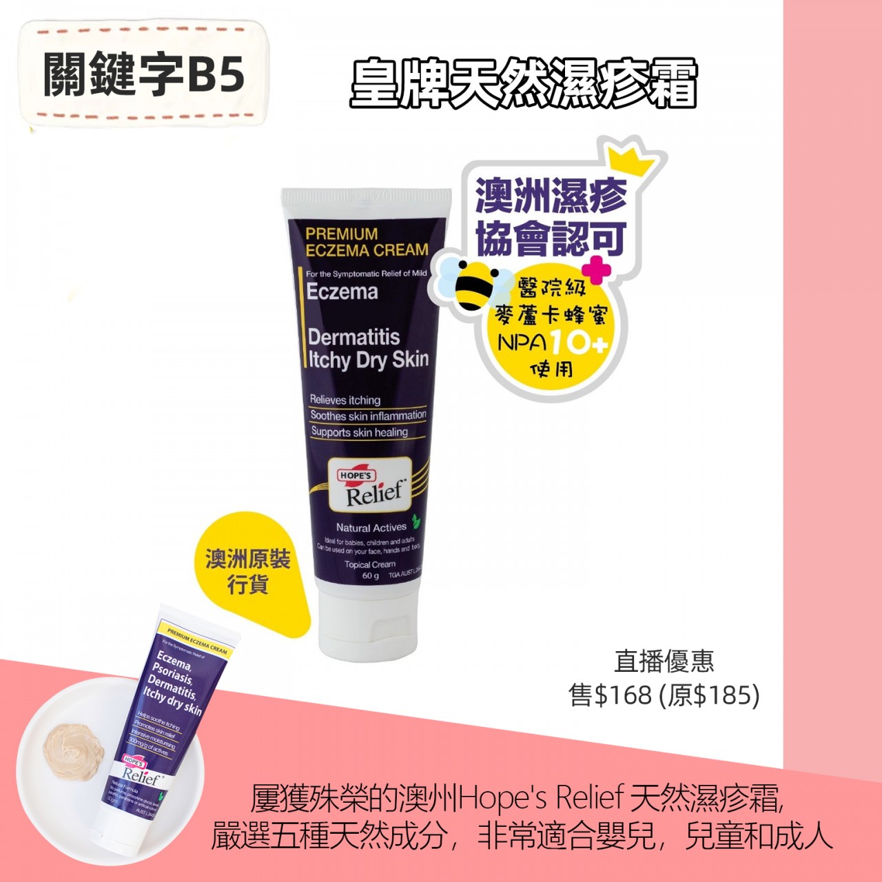 Hope's Relief Premium Cream皇牌天然濕疹霜 專為幫助患有濕疹、牛皮癬和皮膚炎的皮膚人士而開發,不含類固醇,並含有 300 mg/克的活性天然成分