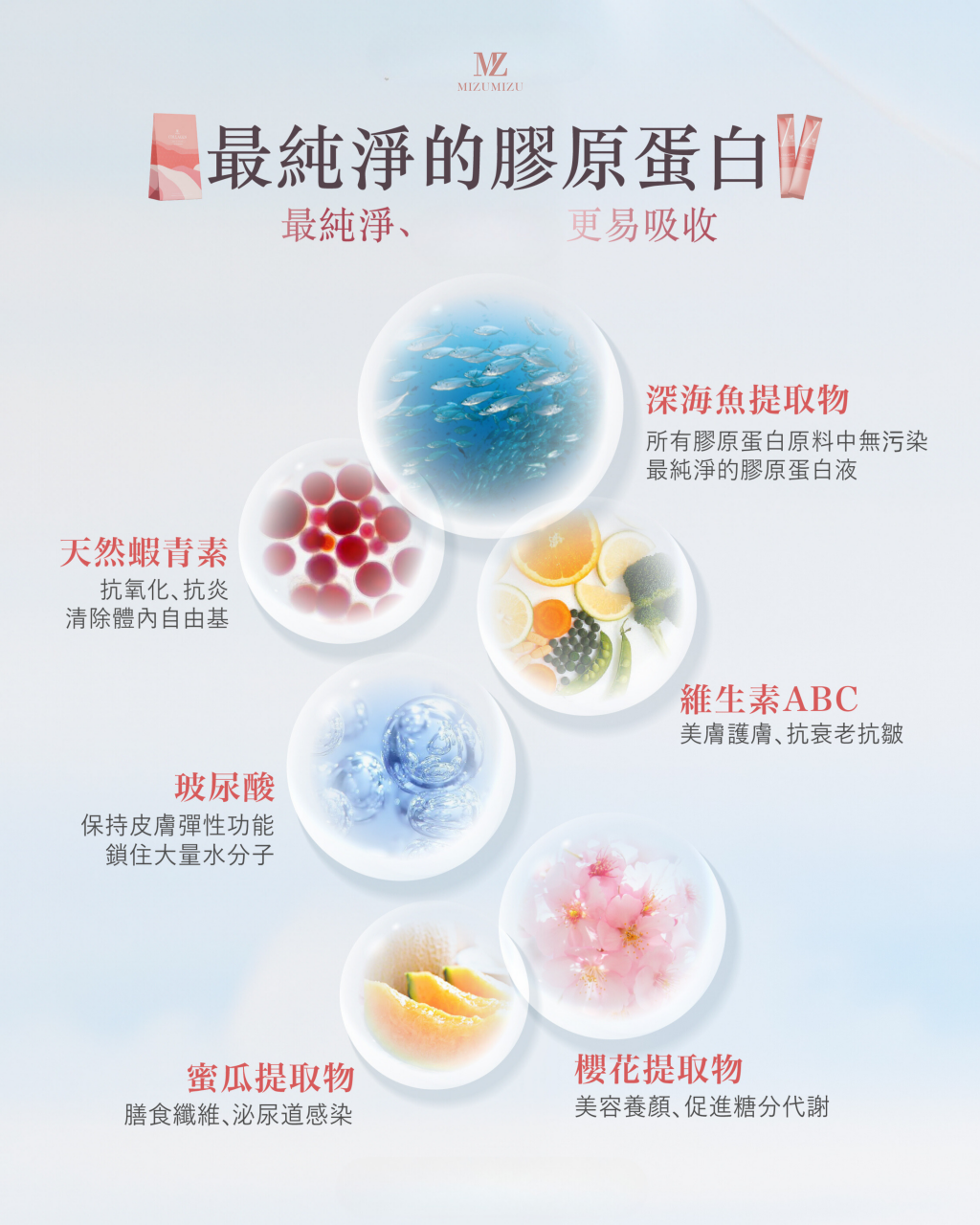 ✦ 主要成份:深海魚提取物、天然蝦青素、多種維生素、透明質酸、櫻花提取物、蜜瓜提取物