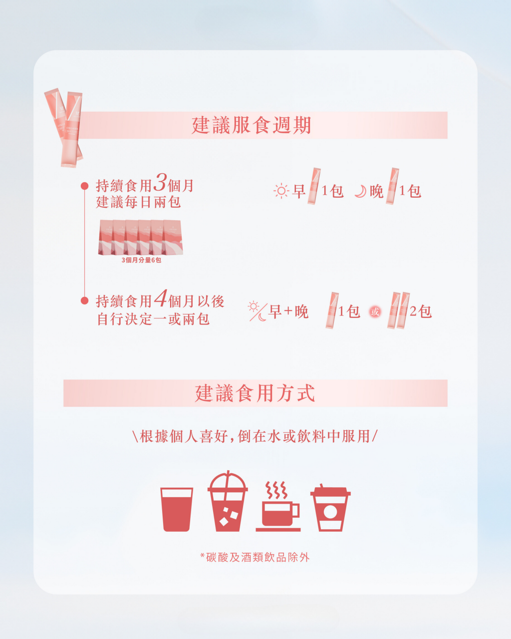 ‣ 根據個人喜好,倒在水或飲料中服用(碳酸及酒類飲品除外)