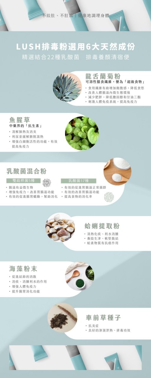 ✦ 主要成份:龍舌蘭菊粉(植物纖維)、車前草種子、乳酸菌混合粉(雙歧桿菌5種、乳酸菌17種)、海藻糖魚腥草粉、蛤蜊提取粉、海藻粉末、茉莉花茶提取粉