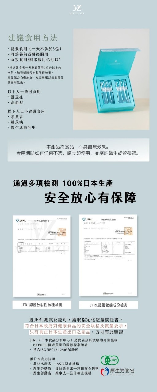 本產品已經日本食品分析中心認證及通過JFRL認證放射性核種檢測和JFRL認證營養成份檢測