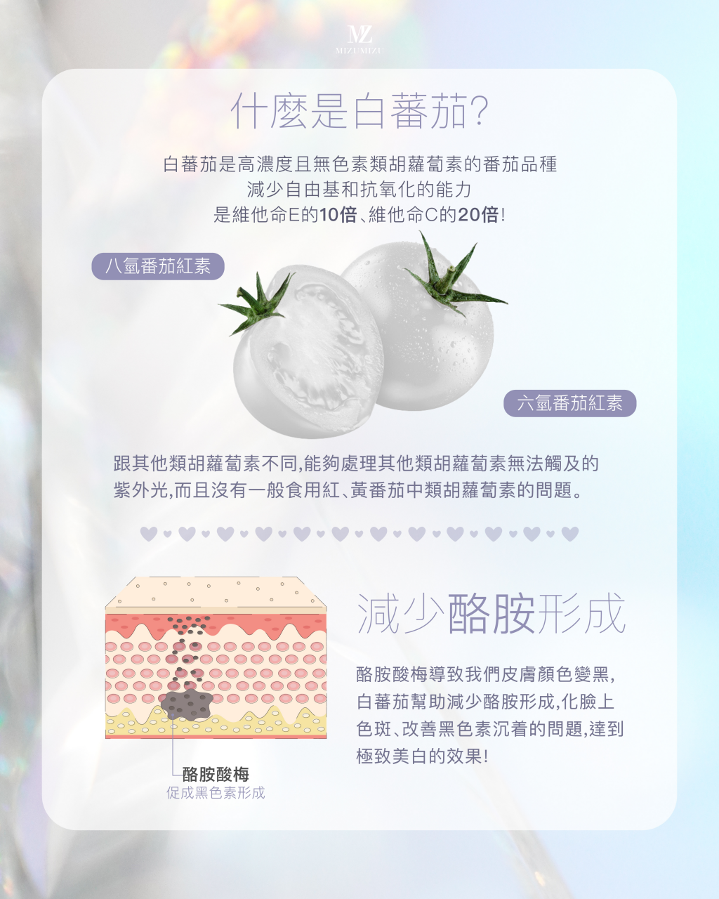 ✦ 主要成份:白番茄、淡水珍珠、蝦青素、L-半胱氨酸、車厘子提取物