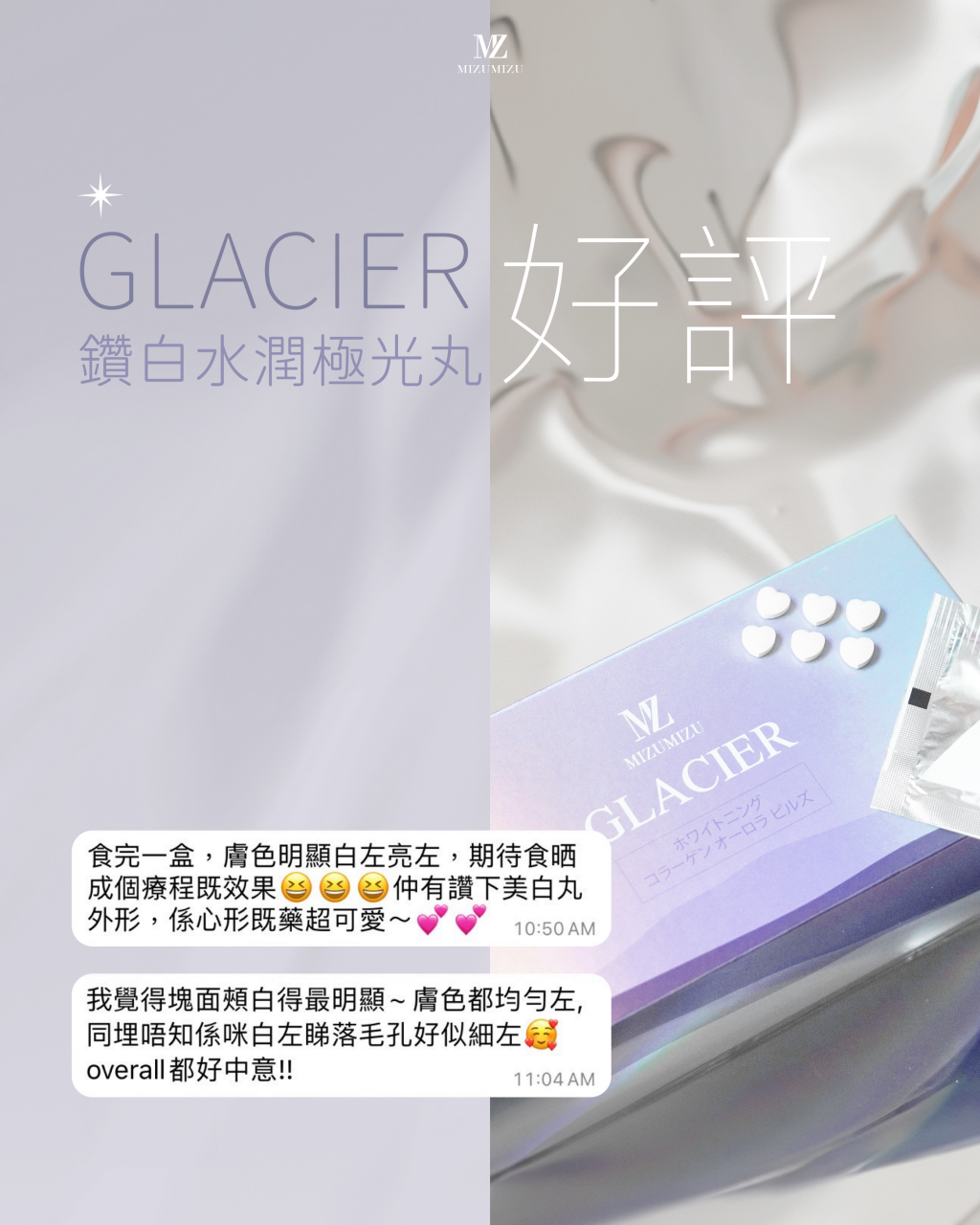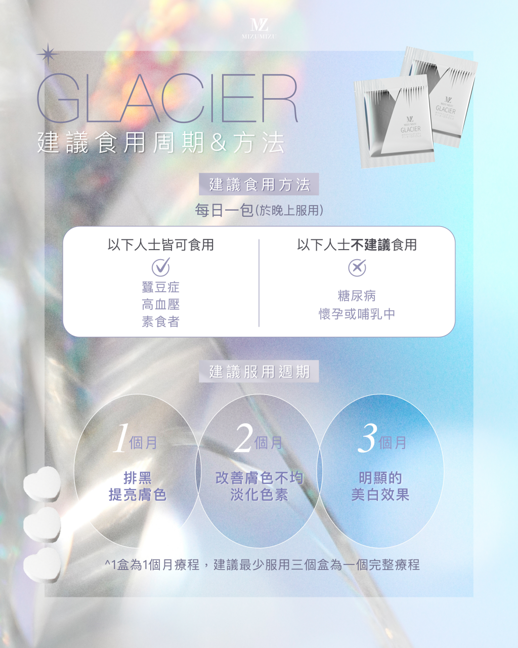 日本配方師和營養師團隊表示進食美白功效的產品(如GLACIER和維他命C) 晚上吃會最好的。因為日間吸收紫外線時進食,會較大可能形成反黑及更容易長斑。吃美白丸外,日常也要使用防曬產品、物理防曬也要做足喔,那美白功效更事半功倍!